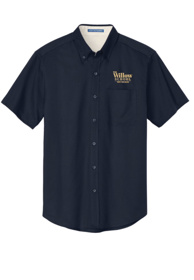 MENS NAVY OXFORD BUTTON DOWN SHORT SLEEVE SHIRT WITH (THE WILLOW SCHOOL) LOGO EMBROIDERED