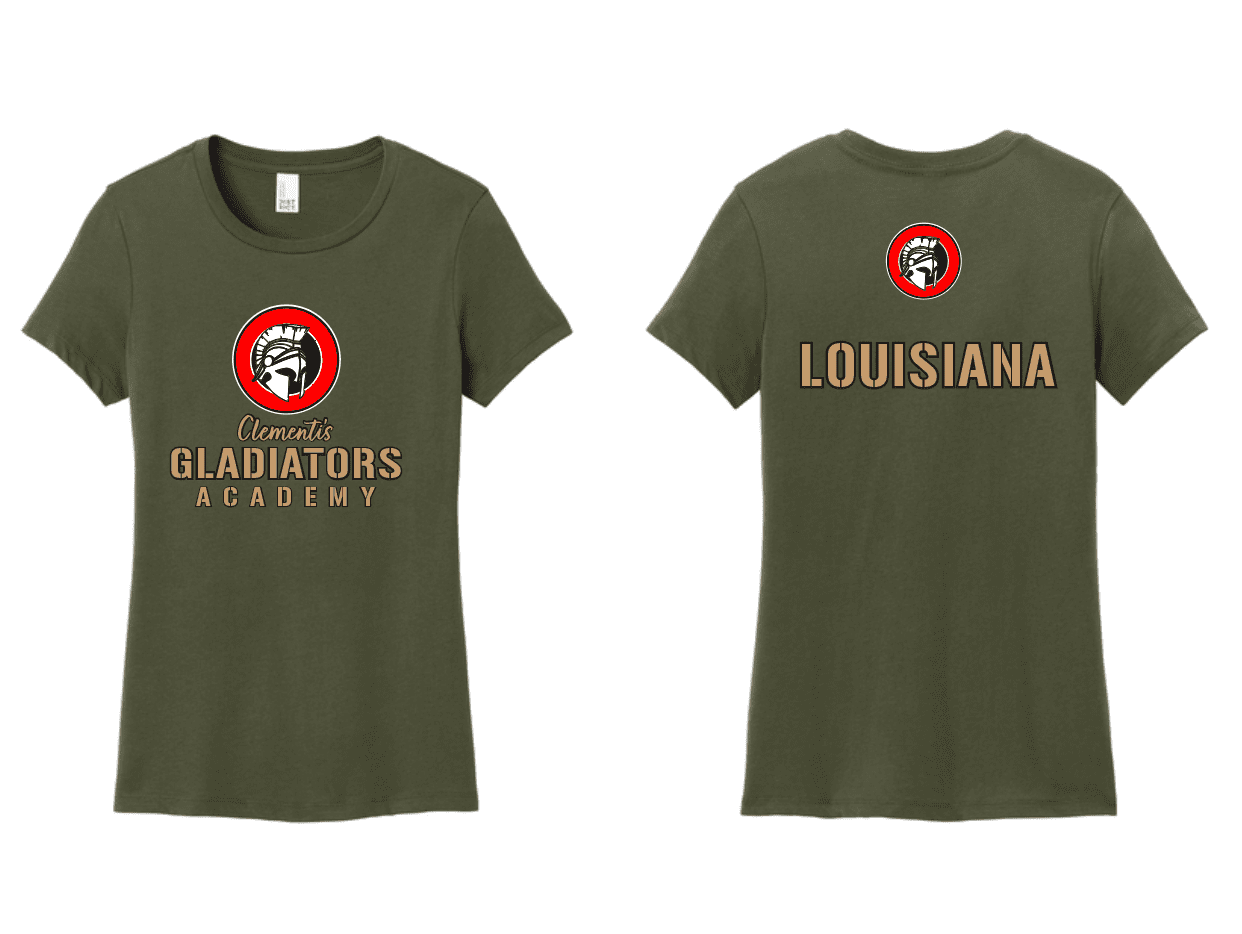 > WOMENS DISTRICT MILITARY GREEN ROUND NECK SOFT COTTON TSHIRT WITH SCREENED LOGOS
