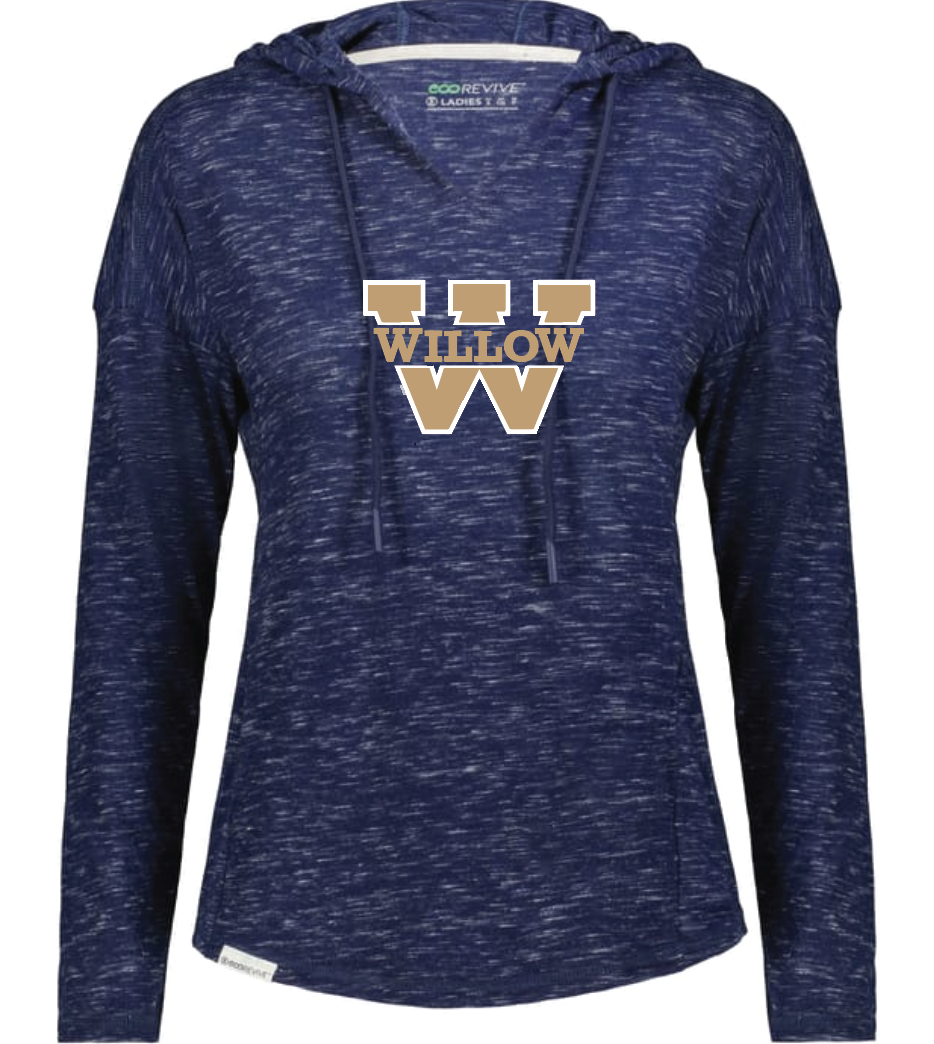 > WOMENS HEATHER NAVY VNECK LIGHT WEIGHT LONG SLEEVE HOODIE WITH SCREENED (WILLOW W) LOGO