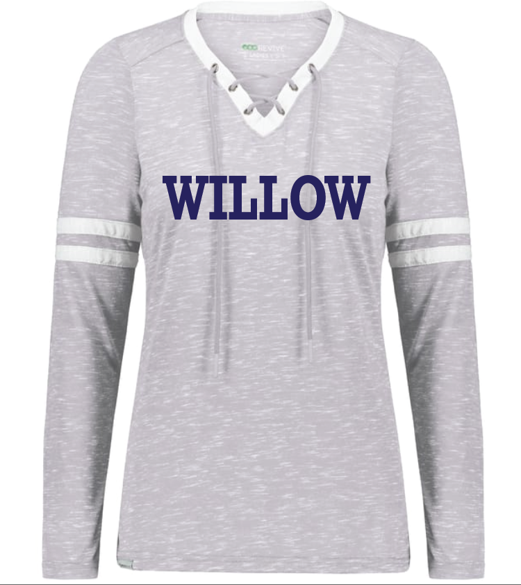 > WOMENS HEATHER WHITE LACE UP VNECK COTTON LONG SLEEVE WITH SCREENED (WILLOW WORD) LOGO